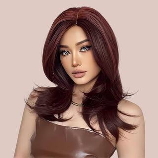 HOC242-6 Long Layered Shoulder Length Wig modelled for House of Chastity. A dark brown mid-length wig simply styled to shape the face and the centre parting with the long-length fringe naturally grades into the sides.