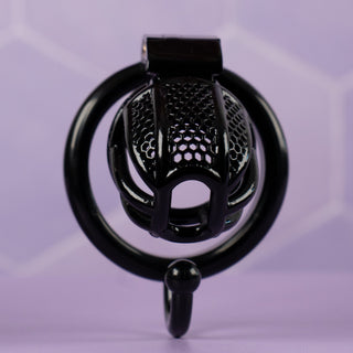 A front view of The Hornet from House Of Chastity, this is the black version of the chastity cage.