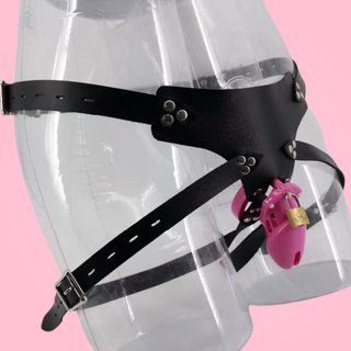 Shown is the pink small cock cage that we offer in our version of the Holy Trainer range. It is shown from the side angle so that you have a full view of the assembled chastity cage, the cock cage is shown attached to a base ring and the integral lock is in place, showing how it fits to the body. This product is the pink version, these cages also come in black and clear.