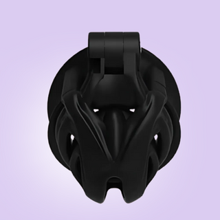 Shown is the black small cock cage that we offer in our version of the Holy Trainer range. It is shown from the side angle so that you have a full view of the assembled chastity cage, the cock cage is shown attached to a base ring and the integral lock is in place, showing how it fits to the body. This product is the black version, these cages also come in pink and clear.