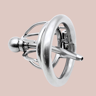 An extra small stainless steel chastity cage with an umbrella bar design, it comes with a detachable urethral tube, detachable barbed ring and comes with an integral lock.