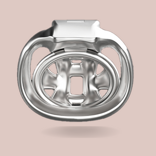 A front on view of the Ultra chastity cage, you can see the centre hole and the patterned circle of holes that surround it to allow air to circulate. From this angle you can see the base ring and how it attaches to the cock cage, along with the integral lock in place.