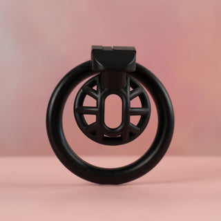 A close up of the BBC Only Super Sissy Pussy Chastity Cage from House Of Chastity, it is a micr chastity cage with an integral lock, which is shown fully assembled.