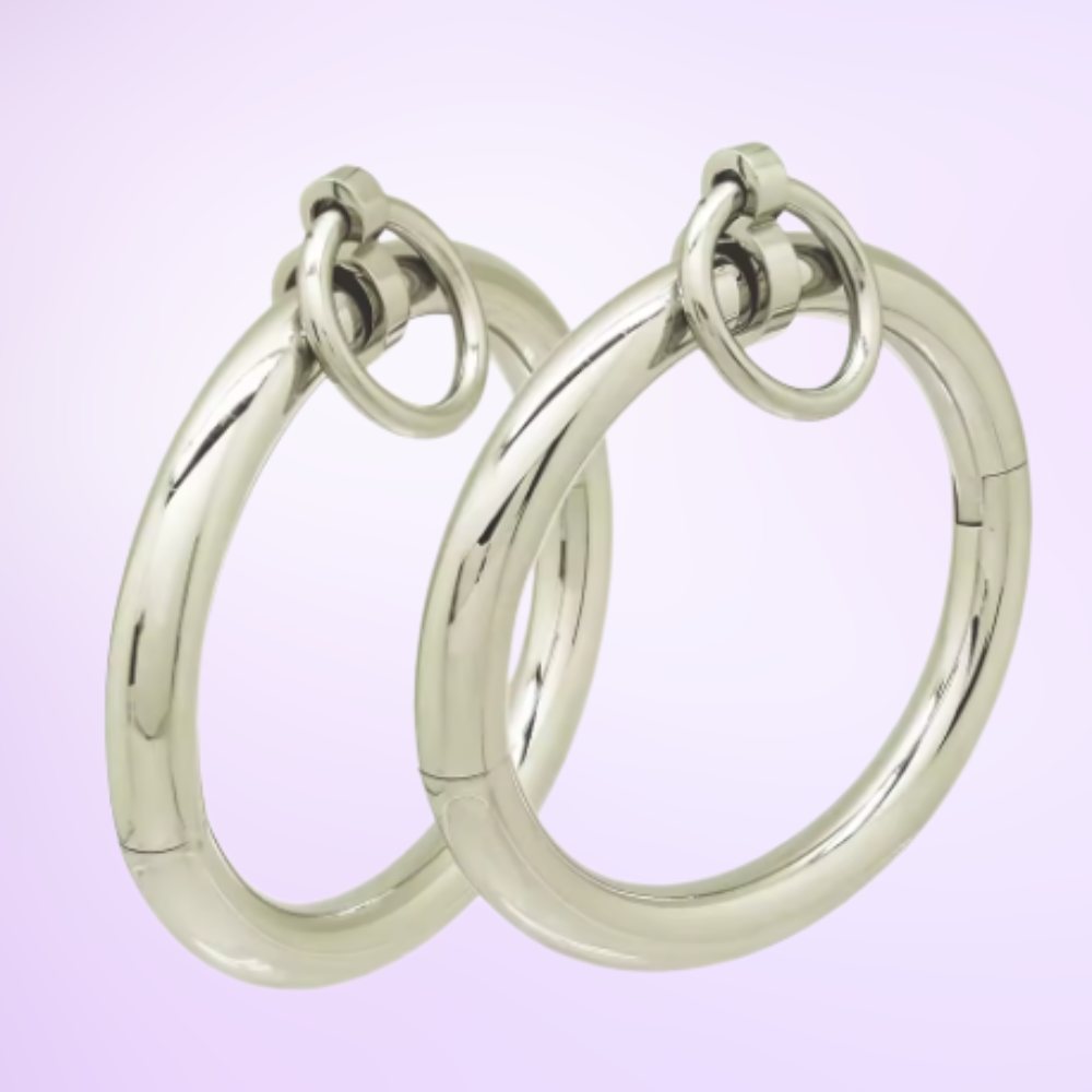 A sleek, stylish pair of stainless steel locking bracelets designed for subtle everyday wear or bold statement styling. Each cuff features a removable O‑ring—wear them clean for a minimalist look, or add the ring to attach a lead or connect to a snap hook.