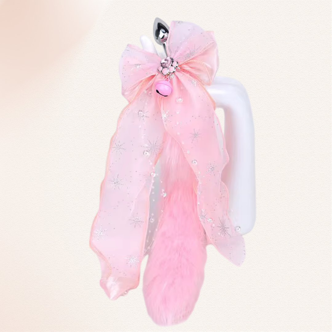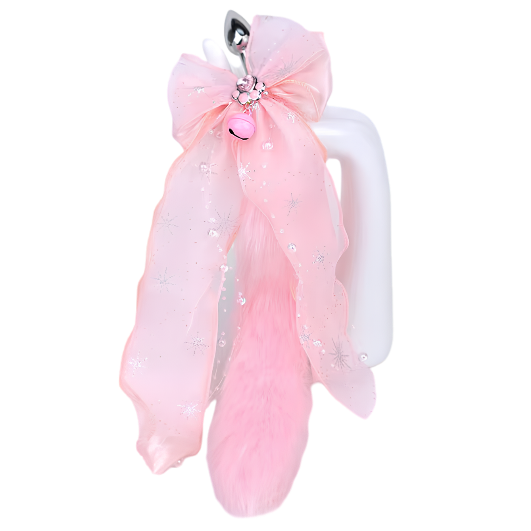 Available colors: The pink and white soft fluffy tail with pink bow, paw print and bell.