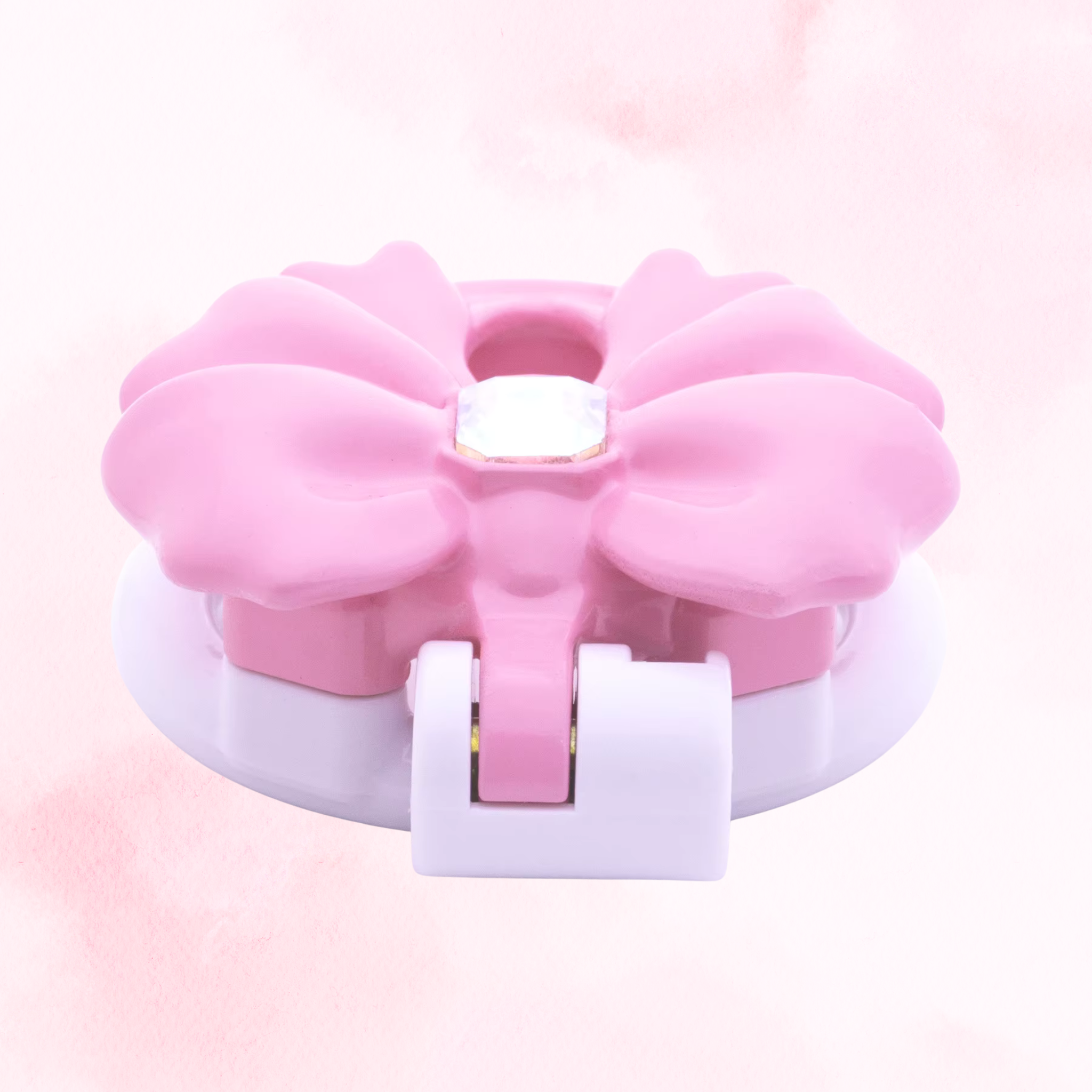 - Signature style: Soft pink finish and bow-tie detailing with gem accents make it a