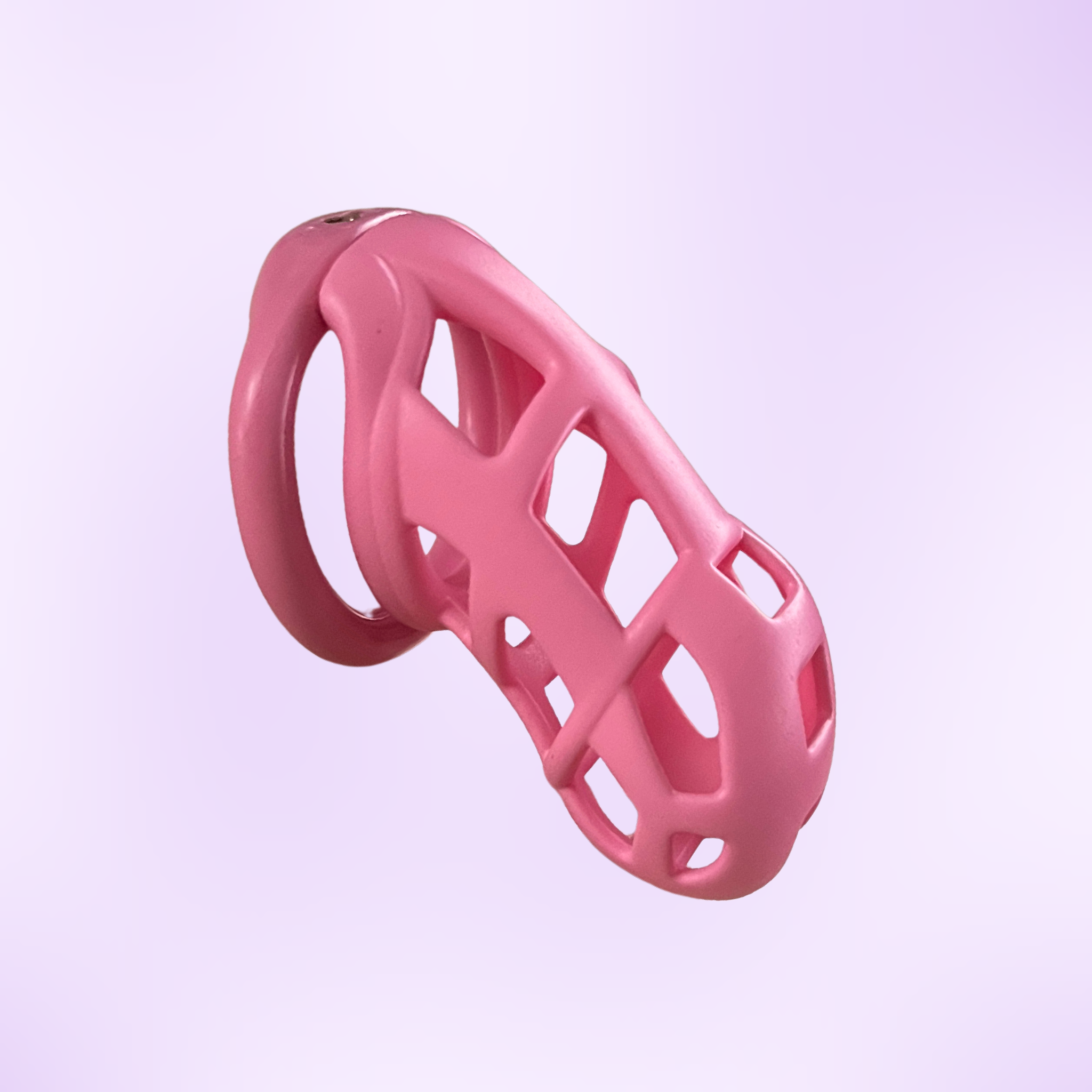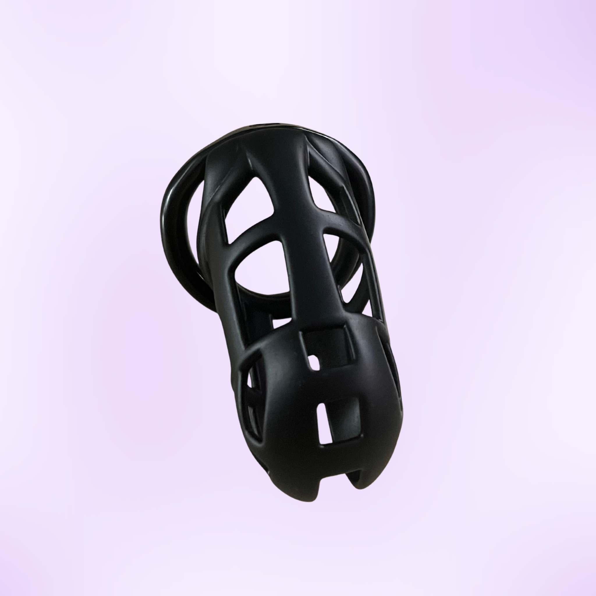 Materials: An internal view of the chastity cage, the black cage is shown on a purple background