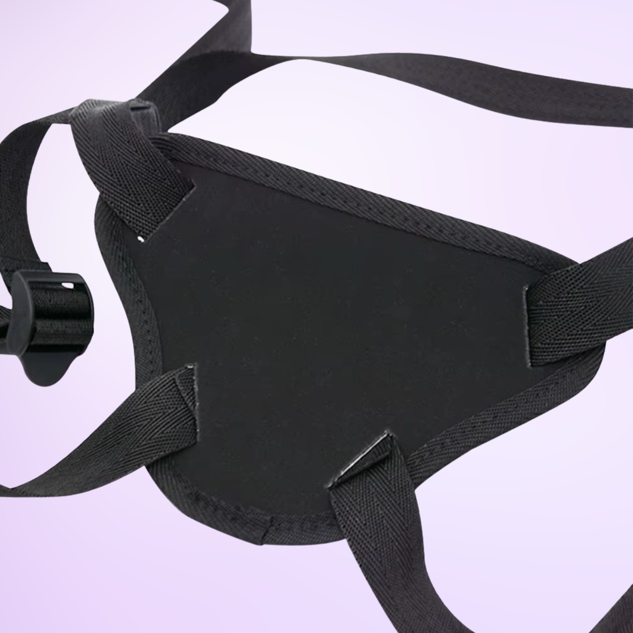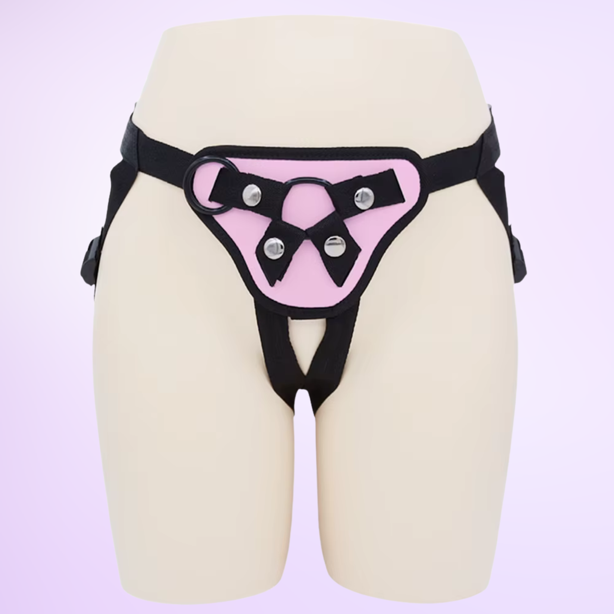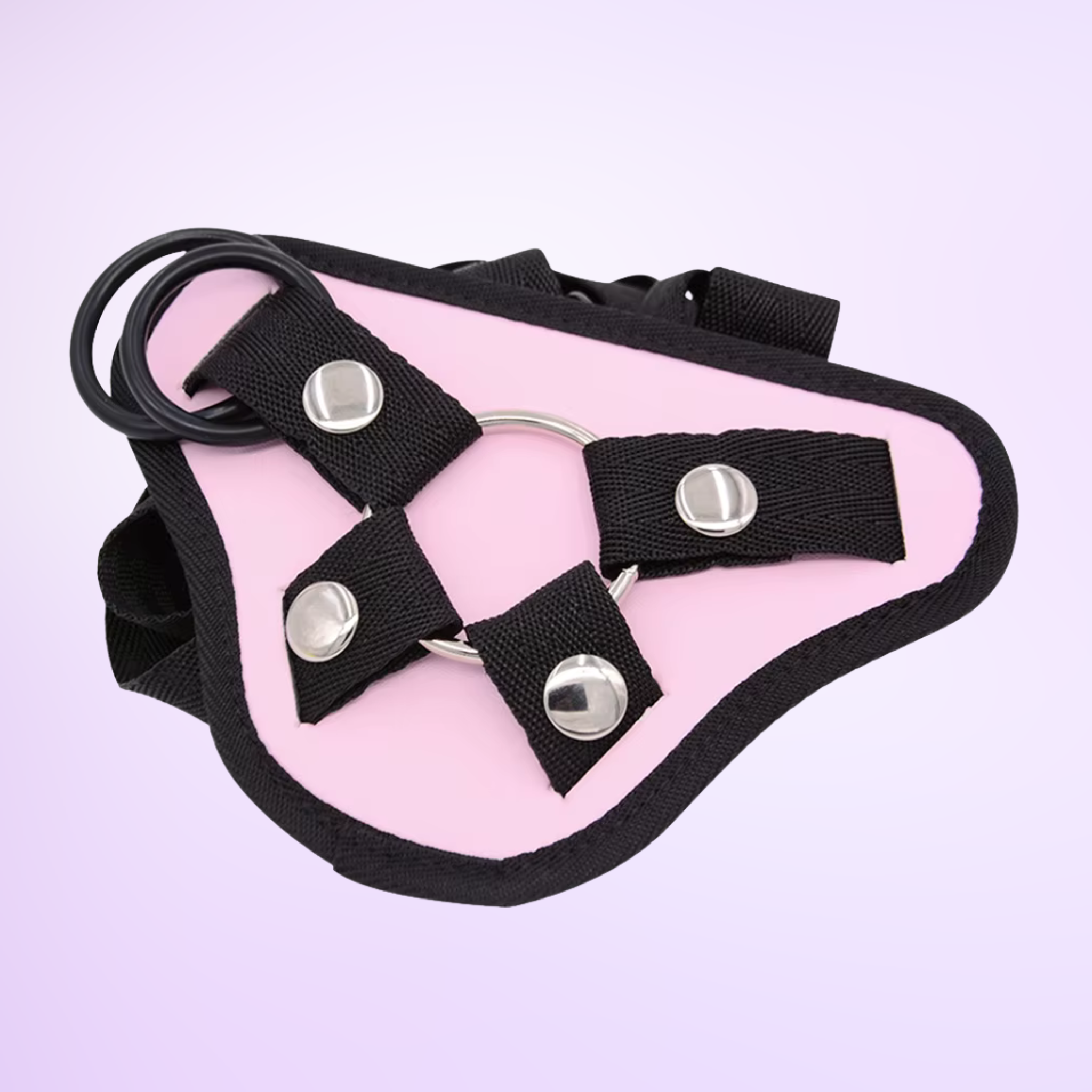 Turn up the fun with a comfortable, adjustable harness built for secure play and reliable The harness with rubber rings shown on a model, it is shown on a purple background performance. Designed to fit a wide range of flat-based dildos (not included), this pink-and-black harness uses interchangeable rings to keep your toy firmly in place—just match your dildo’s base/shaft to the ring size.